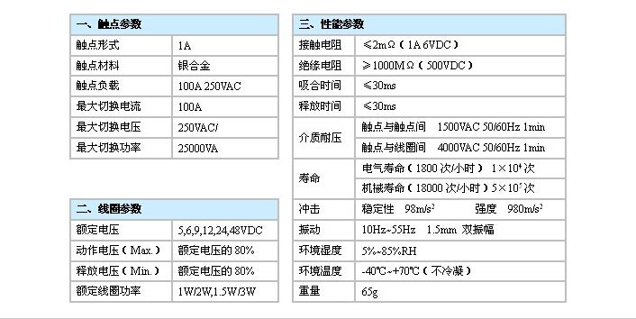 觸點容量:100A 250VAC