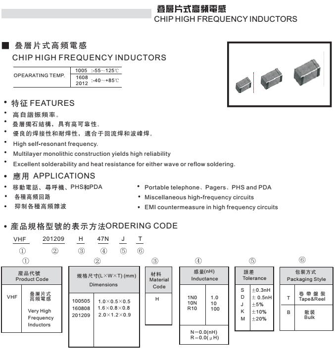 特征: 高自諧振頻率。 疊層獨(dú)石結(jié)構(gòu),具有高可靠性。 優(yōu)良的焊接性和耐焊性,適合于回流焊和波峰焊。 應(yīng)用: 移動(dòng)電話、尋呼機(jī)、PHS和PDA 各種高頻回路 抑制各種高頻雜波;