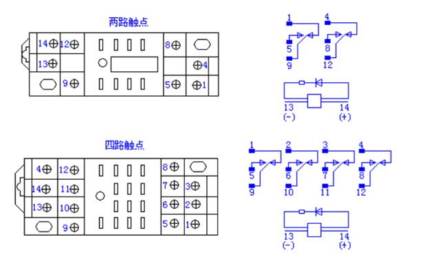 常用小型繼電器原理及底座接線圖 常用小型繼電器原理及底座接線圖 常用小型繼電器有直流式和交流式,其外形一樣,其觸點(diǎn)一般為兩組常開兩組常閉或四組常開四組常閉,對(duì)應(yīng)的插座也比較統(tǒng)一,但有時(shí)印刷的號(hào)... [查看詳細(xì)]