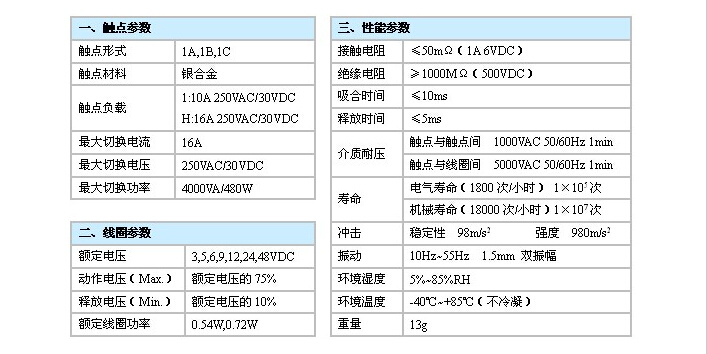 觸點容量:1:10A 250VAC/30VDC H:16A 250VAC/30VDC
