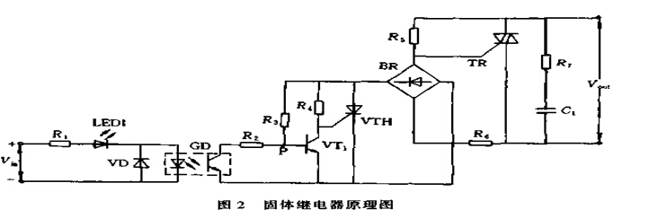 這里僅以應用較多的交流過零型固體繼電器為例,介紹其工作原理。該電路采用了過零觸發(fā)技術,具有電壓過零時開啟,負裁電流過零時關斷的特性,在負載上可以得到一個完整的正弦波形,因此電路的射頻干擾很小。該 電路由信號輸人電路、零電壓檢測控制電路、工作指示電路、雙向晶閘管控制電路和吸收電路幾部分組成。采用了光電耦合器GD作為輸入電路和輸出電路之間的隔離元件,VD是防止Vin正負接反燒壞GD。