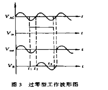 由于觸發(fā)信號方式不同,AC—SSR還分為過零型觸發(fā)(Z型)和非過零型或隨機型(P型)觸發(fā)兩種,如圖為其工作波形圖??梢娺^零型和非過零型之間的區(qū)別主要在于負載交流電流導通的條件。過零型在輸入信號Vin施加的t1時刻,由于此時電源電壓處在非過零區(qū),其輸出端不導通,只有當電源電壓到達過零區(qū)t2時,輸出端負載中才有電流流過。而非過零型在輸入信號Vin施加的t1時刻,不管電源電壓處在什么狀態(tài),負載立刻導通。這兩種類型的固體繼電器關斷條件則相同。