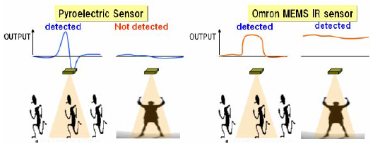 與歐姆龍溫度傳感器能夠檢測(cè)人體(物質(zhì))的存在相比,熱電傳感器只能檢測(cè)溫度變化。