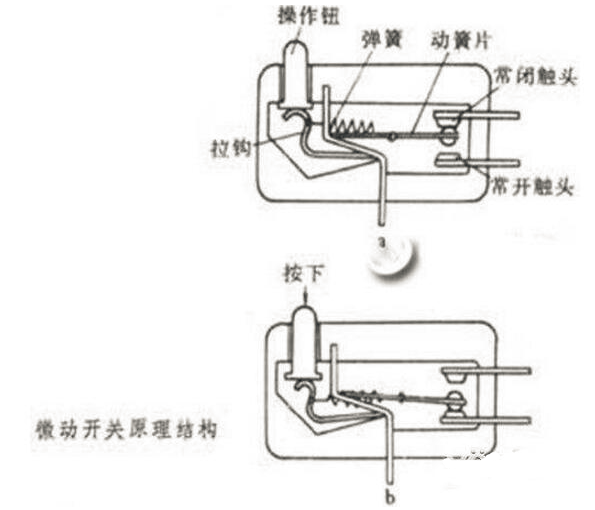 外機械力通過傳動元件(按銷、按鈕、杠桿、滾輪等)將力作用于動作簧片上,當動作簧片位移到臨界點時產(chǎn)生瞬時動作,使動作簧片末端的動觸點與定觸點快速接通或斷開。