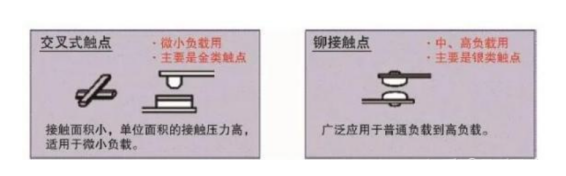 觸點(diǎn)部是微動開關(guān)的心臟部分,通過觸點(diǎn)進(jìn)行電路的ON/OFF。根據(jù)ON/OFF的電壓及電流,采用不同的觸點(diǎn)材料及形狀。材料主要以金、銀及其合金以及金銀電鍍?yōu)橹?。形狀有交叉式觸點(diǎn)、鉚接觸點(diǎn)等(圖4)。