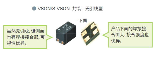 l VSON/S-VSON封裝,雖然無直接引線,但是繼電器側(cè)身焊接結(jié)合處面積大,結(jié)合強度優(yōu)異。