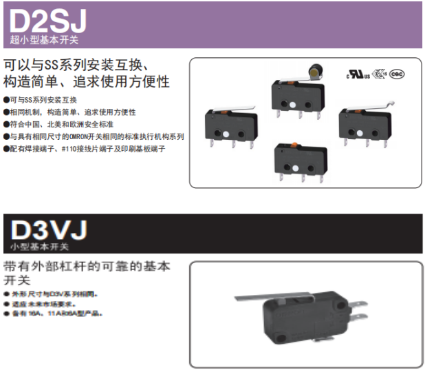 在電動執(zhí)行器中,會有用到微動開關(guān),行業(yè)內(nèi)較多的都是在用歐姆龍的V系列,SS系列,D2SJ系列,以及D3VJ系列,