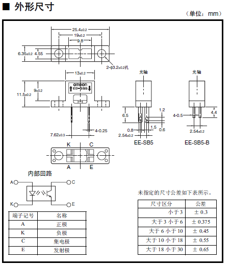 產品說明:微型光電傳感器[反射型] 為防塵構造。 利用可見光濾光器減少日光燈的影響。 可用M3 螺釘安裝。 焊接用端子型:EE-SB5 印刷線路板用端子型:EE-SB5-B