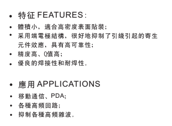特征: 體積小,適合高密度表面貼裝; 采用端電極結(jié)構(gòu),很好地抑制了引線引起的寄生 元件效應(yīng),具有高可靠性; 低電阻、高電流和高電感量; 優(yōu)良的焊接性和耐焊性。