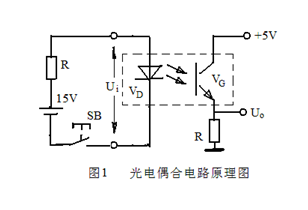 光電偶合可以實(shí)現(xiàn)電路之間的電氣隔離,且具有動(dòng)作靈敏、響應(yīng)速度高、輸入/輸出端間的絕緣(耐壓)等級(jí)高、抗干擾能力強(qiáng)等特點(diǎn)。光電耦合是將發(fā)光元件和光敏元件組合在一起,通過發(fā)光元件把電轉(zhuǎn)換成光,再利用光敏元件的光感特性將光轉(zhuǎn)換成電。常用的光電耦合電路如圖1所示。