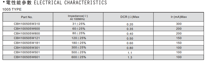 CBH100505W310低頻低阻型磁珠