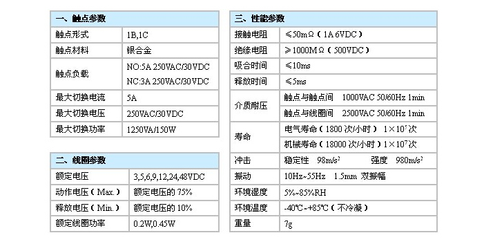 觸點容量:NO:5A 250VAC/30VDC NC:3A 250VAC/30VDC