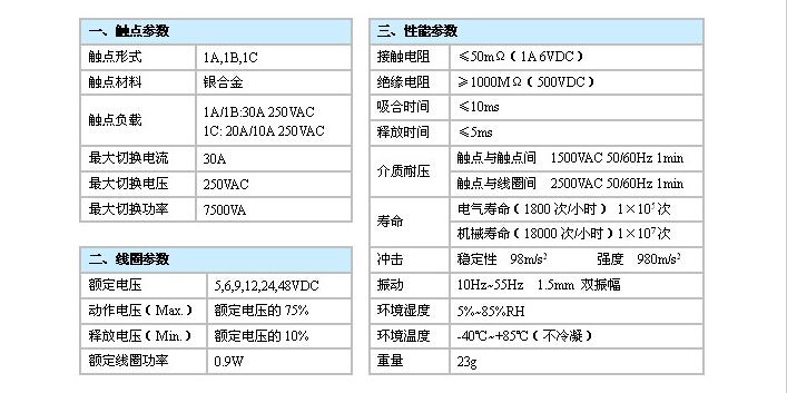 觸點(diǎn)容量:1A/1B:30A 250VAC 1C: 20A/10A 250VAC