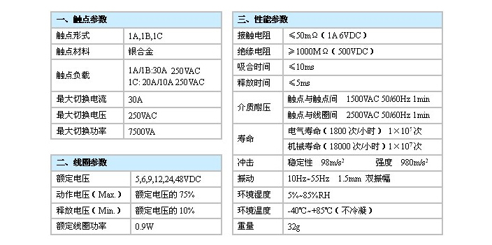 觸點(diǎn)容量:1A/1B:30A 250VAC 1C: 20A/10A 250VAC