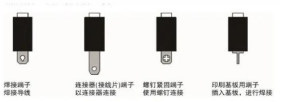 具有連接開關(guān)和外部電路的作用,根據(jù)連接方法,可以分為焊接端子、接線片端子、螺釘緊固端子、印刷基板用端子。(圖5)